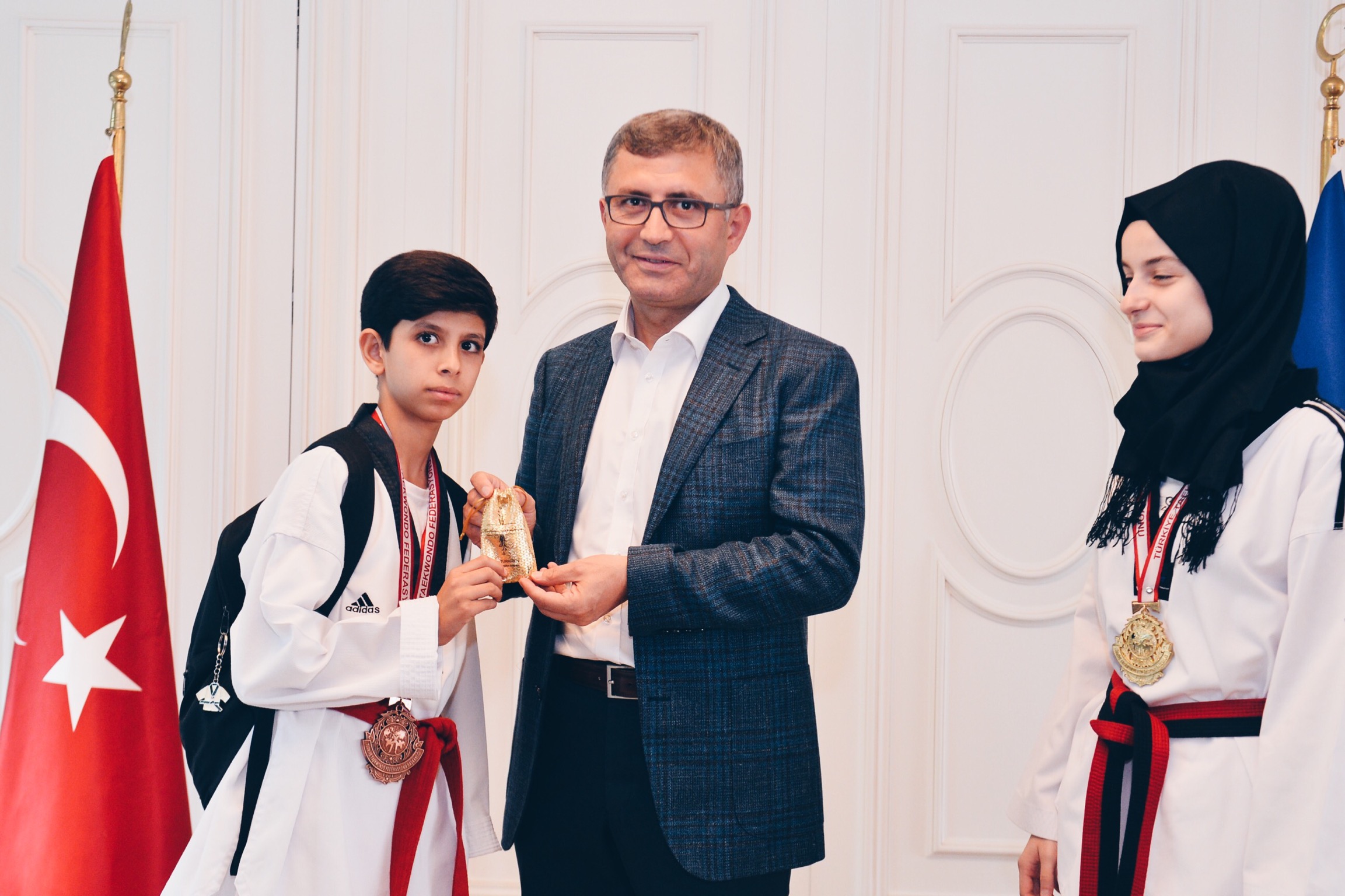 Üsküdar Belediyesi, tekvando şampiyonasında birinci ve üçüncü olan sporcuları ödüllendirdi. Sporculara birer kese altın hediye eden Üsküdar Belediye Başkanı Hilmi TÜRKMEN, spora yaptıkları yatırımları anlattı.